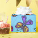 Purple and pink modern design featuring playful butterflies on a blue background.