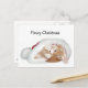 Orange and white tabby kitten plays in a Santa hat and wishes a Mewy Christmas photo Christmas postcard. Text can be easily changed or removed