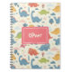 This personalised playful notebook features colourful, whimsical dinosaurs smiling in fun poses. A hand-drawn name label is in the centre of the design.