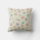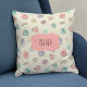 This adorable personalised throw pillow features doodles of simple hearts, dots, and wavy lines painted with soft pastel watercolors in blush pink, mint green, lavender, and pale yellow.