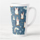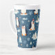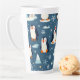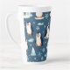 The image is a pattern of cute cartoon penguins on a blue background with snowflakes. The penguins are depicted in various poses: standing, waving, wearing hats and scarves, and interacting with winter elements like snowdrifts, Christmas trees, and igloos. The overall aesthetic is cheerful, festive, and child-friendly.