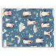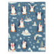 The image is a pattern of cute cartoon penguins on a blue background with snowflakes. The penguins are depicted in various poses: standing, waving, wearing hats and scarves, and interacting with winter elements like snowdrifts, Christmas trees, and igloos. The overall aesthetic is cheerful, festive, and child-friendly.