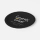 Congrats Grad! Playful white script with golden graduation cap accent, graduation party paper plates. Features, black colour background.