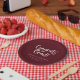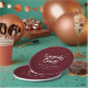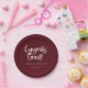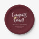Congrats Grad! Playful white script with golden graduation cap accent, graduation party paper plates. Features, burgundy red color background.