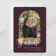 Playful white script with golden graduation cap accent, arch frame photo graduation announcement. Features, dark purple color background.