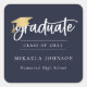 Playful white script with golden graduation cap accent, stickers. Features, navy blue color background. Template text lines for graduation year, graduate's name and school.