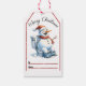 A cheerful snowman wearing a Santa hat sits on a toilet, bringing humour to holiday gift tags. It's a delightful blend of festive spirit and quirky fun for the Christmas season.