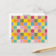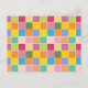 Colourful chequered postcard designed with various shades of yellows, orange, greens, lavender and blue.