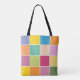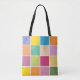 Colourful chequered tote bag designed with various shades of yellows, orange, greens, lavender and blue.