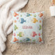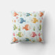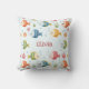 This personalised throw pillow features smiling tropical fish in vivid shades of red, blue, green, yellow, and orange, swimming among seaweed, coral, and bubbles, set against a soft light blue background.