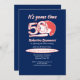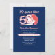 Step up to the plate for a legendary celebration! ⚾ This sporty 50th birthday design features the bold number 50 filled with a baseball pattern and topped with a classic baseball helmet, all in red and white on a dark blue background. The playful text “is playing his 50th inning” and “join us at home base” sets the tone for a fun, all-star celebration. On the back, the same baseball graphic appears with the words “Let’s play ball!” for a perfect finishing touch.