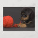 rottweiler 1,5 months old puppy is playing with red yarn ball