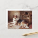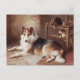 This cute painting by Walter Hunt shows a Collie lying in front of a chair. Underneath the chair is a puppy looking up at a kitten on the seat of the chair. This image has been cleaned and slightly modified from the original public domain image.