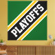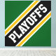 This sporty football design features athletic PLAYOFFS text inside highlighted wide diagonal black, white, and golden yellow racing stripes against forest green background. The colours and text in this design can be personalised.