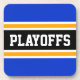 This sporty, colourful design features athletic PLAYOFFS text inside a highlighted wide black stripe with white and yellow pinstripes against outer vivid blue stripes. The text and colours in this design can be personalised.