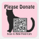 Custom QR Code Cat Theme stickers say "please donate, scan to help feed cat(s)". Black cat silhouette design on pastel pink background (background colours can be changed to suit your taste by clicking the personalise button)