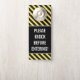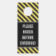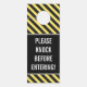 This design features the message "PLEASE KNOCK BEFORE ENTERING!" in bold white text, along with yellow and black coloured alert stripes.