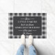 A cute typography based design with an important message asking guests to remove their shoes at the door. Black doormat reads "Since little fingers touch our floors, kindly leave your shoes at the door" in retro lettering with a rustic plaid border. Personalise with your family name along the bottom.