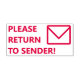 This rubber stamp design features the message "PLEASE RETURN TO SENDER!", along with an envelope symbol. It could be used to indicate that received postal mail has been delivered to the wrong address or to an unknown recipient, and should be returned to the sender.