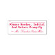This simple rubber stamp design features the message "Please Review, Initial And Return Promptly", along with a line for a signature or initials to be written above. It also features a custom name. It could perhaps be used by a teacher, educator or tutor to ask a student’s parent(s) or guardian(s) to review and acknowledge the mark that a student received on a test, quiz, paper, or some other school assignment.