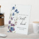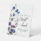 The elegant and modern floral wedding guest book table sign features watercolor royal blue and purple flowers, sage green botanical leaves, and eucalyptus. please find more matching designs in my "golden snitch" store.