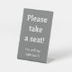 This respectable design features the message "Please take a seat!", along with the message "We will be right back". This could be used in a seating area to inform customers or visitors that they will be assisted shortly, and that they should take a seat until then.