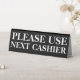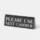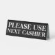 Ideal for any business or supermarket chain that serves customers using tellers. A black background has a bold white font on it that says "please use next cashier". Personalise the wording to any of your choice and feel free to add a background colour and to change the colour, style and size of the font to suit your business requirements.