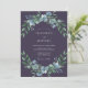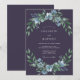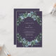This design features a rich plum backdrop that creates a moody and sophisticated atmosphere. Delicate watercolor florals in shades of dusty blue and sage green form a lush botanical arrangement. Small, elegant blooms resembling pansies and roses are nestled among soft, tapered leaves. This cool-toned palette is ideal for a seasonal evening event.