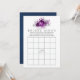 Dark plum purple roses and silver glitter tropical foliage bridal shower bingo cards with a navy blue watercolor wash reverse.