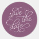 Elegant and simple save the date stickers are perfect for sealing your save the date envelopes. Rich plum purple and white design features "save the date" in embellished white script typography with a subtle heart worked into the design.
