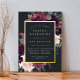 Chic floral bat mitzvah invitation features a border of burgundy marsala purple, blush pink, and dusty blue flowers, with lush botanical foliage and greenery and gold foil trim. Personalise with your temple ceremony and celebration details in modern lettering on a rich charcoal background.