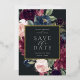 Our Plum Blossom wedding save the date frames your wedding details with an elegant square border of lush watercolor foliage and flowers in blush pink, burgundy plum purple and dusty blue, with real gold foil trim on a rich charcoal background.