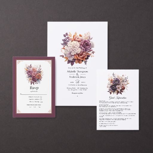 Plum, grey, copper and dusty rose floral envelope customisable to your event specifics.