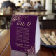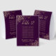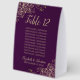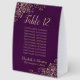 These beautiful table tent signs will make it easy for your guests to find their tables at your wedding reception. The elegant plum purple and gold design features lacy script calligraphy with ornate floral curls and swirls in the corners. There is space for a list of up to 10 names or people seated at the table, as well as the names of the couple and the wedding date.