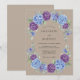 Rich plum and cornflower blue watercolor roses and hydrangeas form a lush arrangement on a warm taupe background. Silver-green eucalyptus foliage adds a natural touch to the botanical design. This artwork creates a romantic and earthy atmosphere for an outdoor or nature-inspired event. The colour palette blends deep jewel tones with soft neutrals.