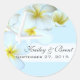 Light blue wedding sticker, or favour label, to customise with white plumeria flowers and a starfish.  Bride and groom names and wedding date text is dark grey over a white "ribbon" on a small, round sticker (or choose the 3 inch size.)