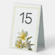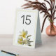 Wedding table number sign with white and yellow plumeria flowers. This plastic, standing sign has floral design and numbers on both sides. White with black numbers and white frangipani flowers with yellow centres and buds. Each side has a thin line border and choose from three sizes.