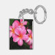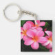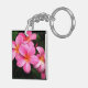 Acrylic keychain shown with a photo print of pretty tropical plumeria flowers located in the hawaiian islands.