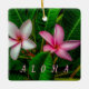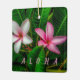 This Ceramic Ornament showcases the beauty of the tropical flowers in this original photograph by ZoeSPEAK. These Plumeria flowers are pink, and white, but they can be found in other beautiful colours. The leaves of the plants are large, and shaped like the flower petals, making a lush green background. Plumerias are known as the “lei flower” In Hawaii. There is optional text (ALOHA) which is set for you to personalise or delete if you prefer.