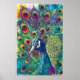 With a flourish, the peacock displays his magnificent tail feathers in all the tones of precious jewels. A watercolor painting of a brilliant bird.Poster.