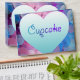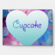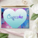Design: Soft pastel heart with "Cupcake" text, set against a whimsical pink, purple, and blue background