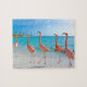 Pink flamingos on a white sandy beach puzzle.