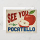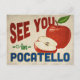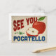 A charming Pocatello Idaho vintage travel postcard featuring a lovely red apple, along with fun retro style text that says, "See you in Pocatello"
