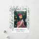 These beautiful holiday photo cards feature an imprint / drawing of poinsettias, berries, and sprigs in dark forest green over a white background. The back of the card contains a matching pattern.