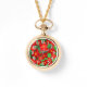 This women's watch has a Christmas design of poinsettias scattered around on a field of green stripes.