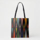This tote bag has a mid-century modern design of triangles facing each other repeating across the design.