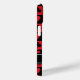Hearts Clubs Spades Diamonds Pattern iPhone 15 Case - Poker themed iPhone 15 cover in black and red with a custom name template in black and white.
