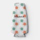 This bottle cooler has a mid-century modern design of circles with lines behind in orange and green.