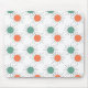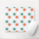 This mouse pad has a mid-century modern design of circles with lines behind in orange and green.