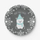 Baby shower paper plates featuring an illustration of a baby polar bear wearing a blue hat and scarf over a chalkboard inspired background surrounded by snowflakes. Personalise the name.